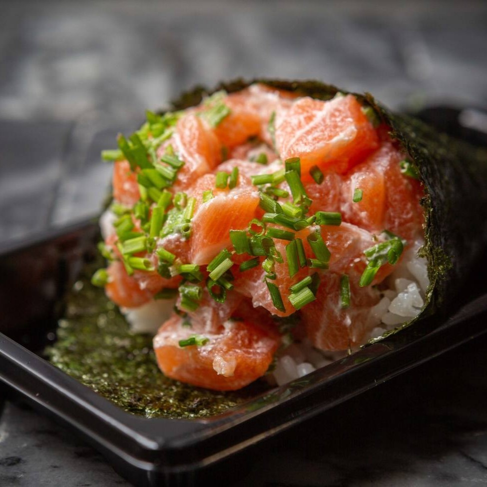 É feito com arroz, salmão em cubos, cream cheese e cebolinha, enrolados em alga nori e cortado em cone.