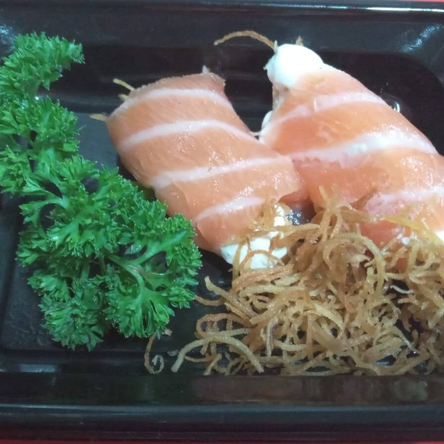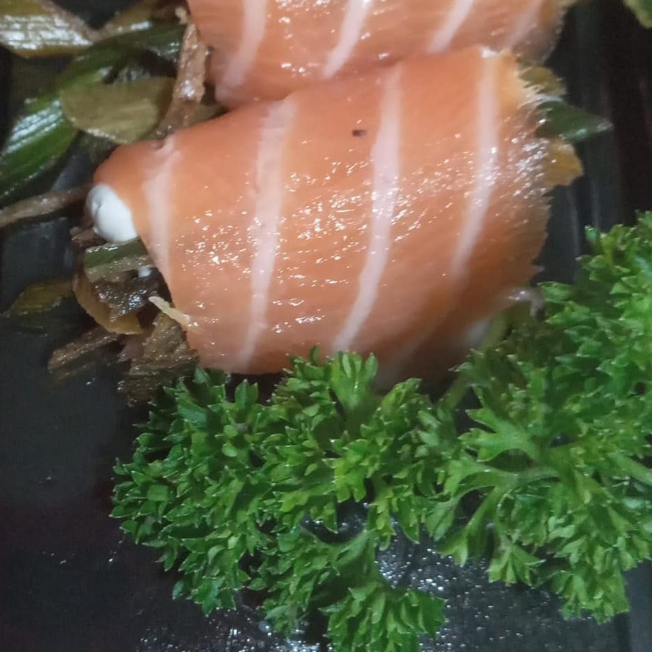 5 lâminas de salmão com cream cheese recheado com cebola roxa.