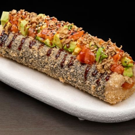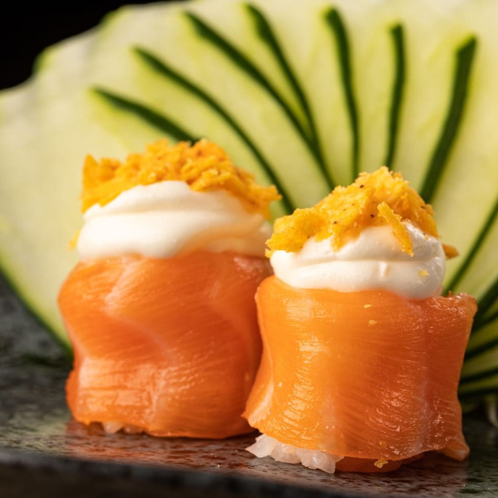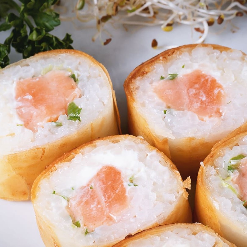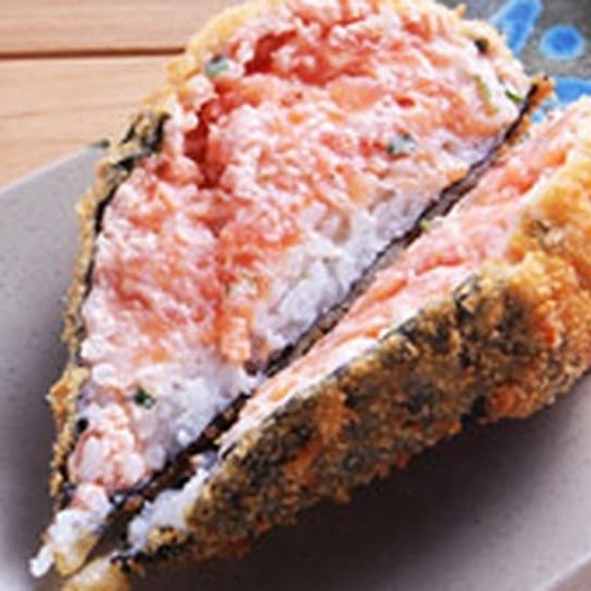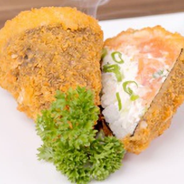É feito com arroz, salmão em cubos, cream cheese e cebolinha, enrolados em alga nori, cortado em cone e empanado na farinha panko.