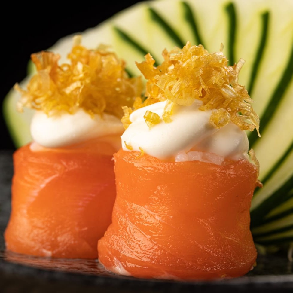 5 lâminas de salmão com cream cheese recheado com crispy de alho poró