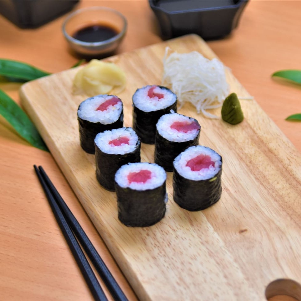 É um roll com alga nori por fora, arroz por dentro e recheio de sua escolha.