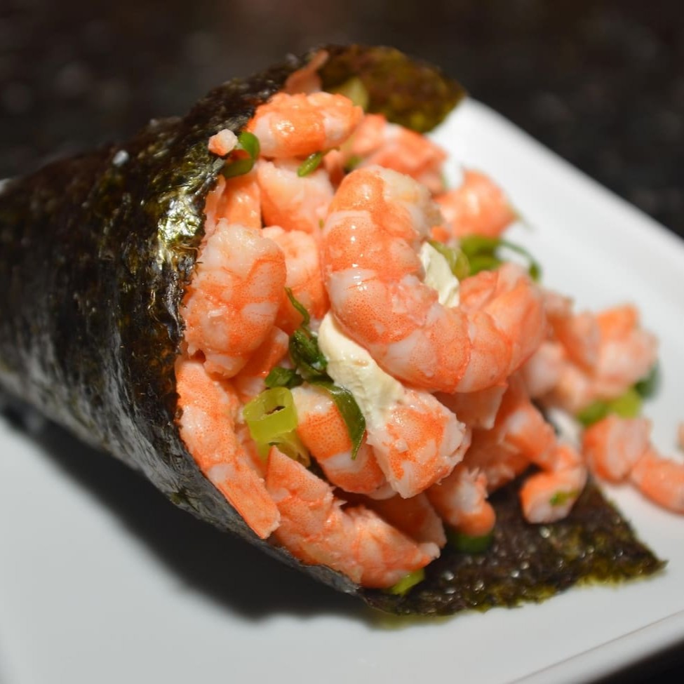 É feito com arroz, camarão salteados, cream cheese e cebolinha, enrolados em alga nori e cortado em cone.