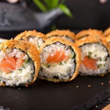 Nosso hot roll contém 10 peças. Feito com arroz, salmão, cream cheese , enrolados em alga nori e empanados na farinha panko.