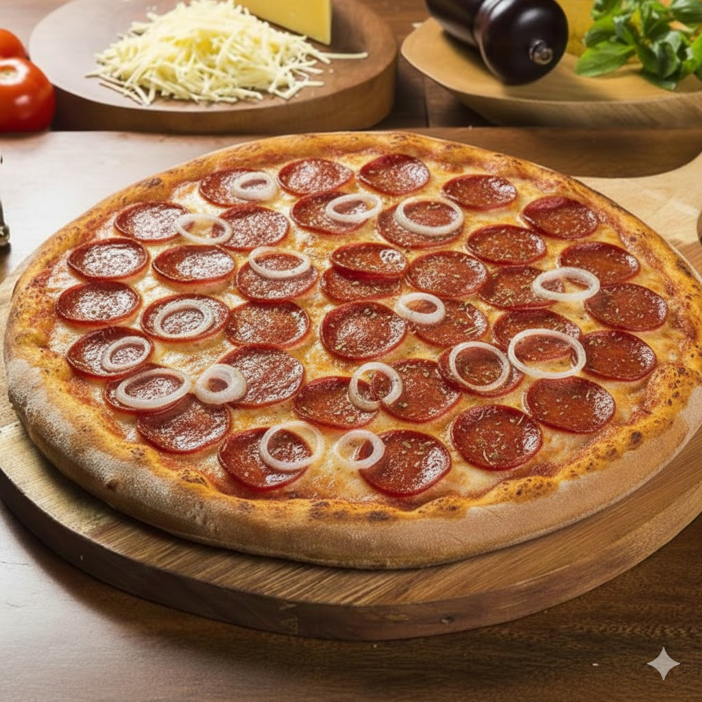 MOLHO DE TOMATE, MUÇARELA, CALABRESA, CEBOLA E OREGANO
