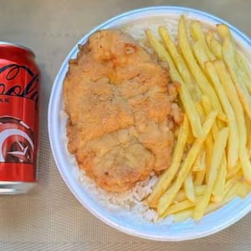 Frango a Milanesa com arroz e batata frita + Bebida de sua escolha