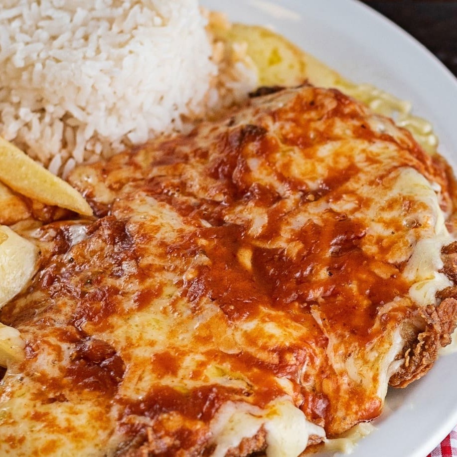 Um (1) Bife a parmegiana com arroz e batata frita.