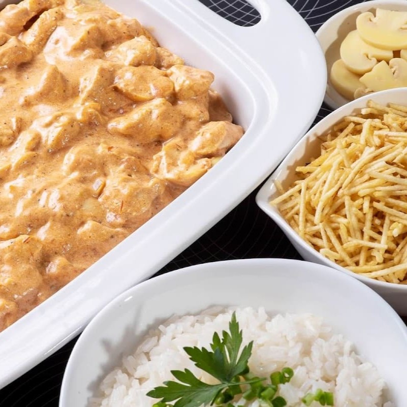 Marmita - Estrogonofe de Frango com Arroz e Batata palha para 2 Pessoas. Arroz e batata palha *foto meramente ilustrativa