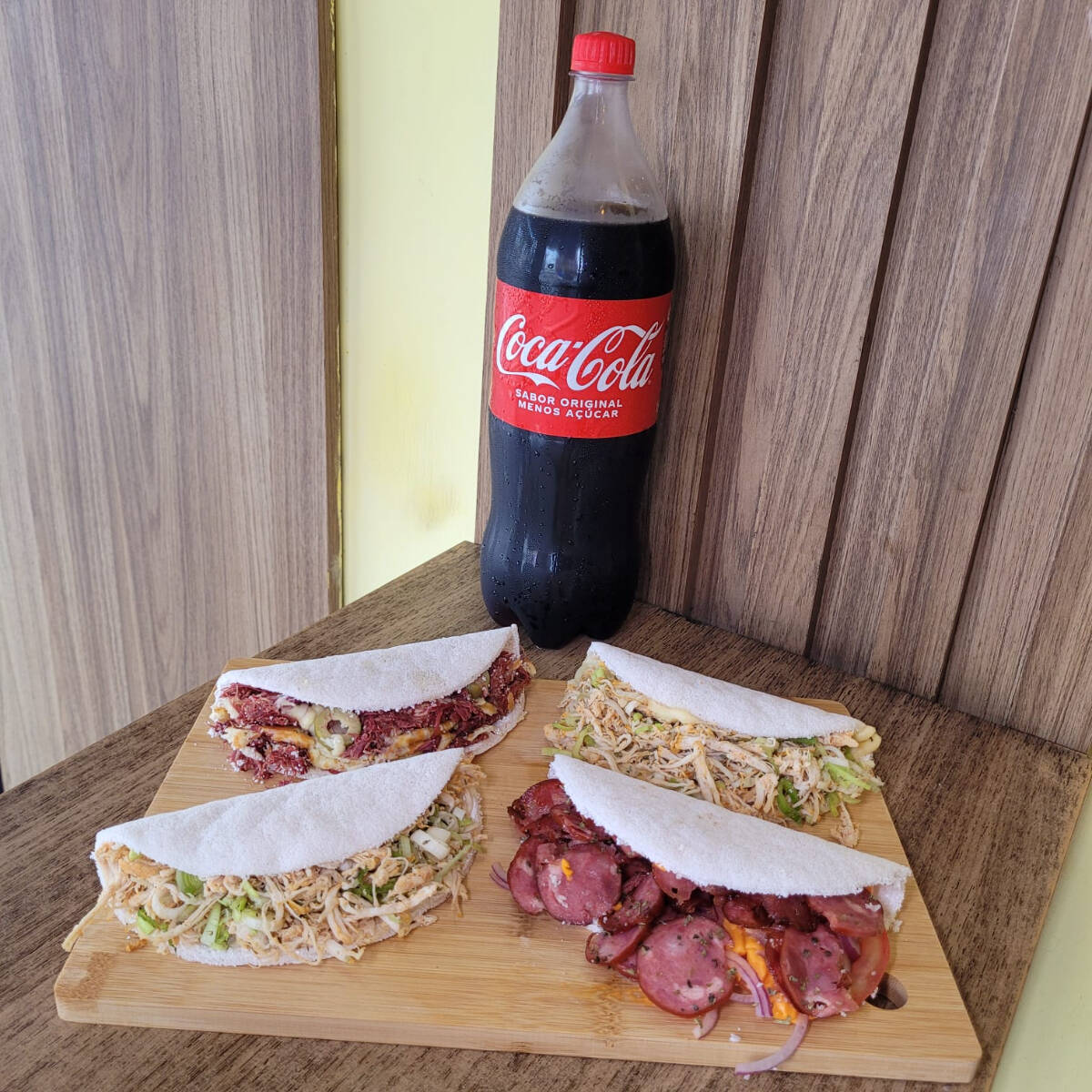 Goma de tapioca artesanal, calabresa fatiada, rodelas de tomate frescas, cebola roxa e azeitonas verdes, queijo derretido finalizada com um toque de orégano.