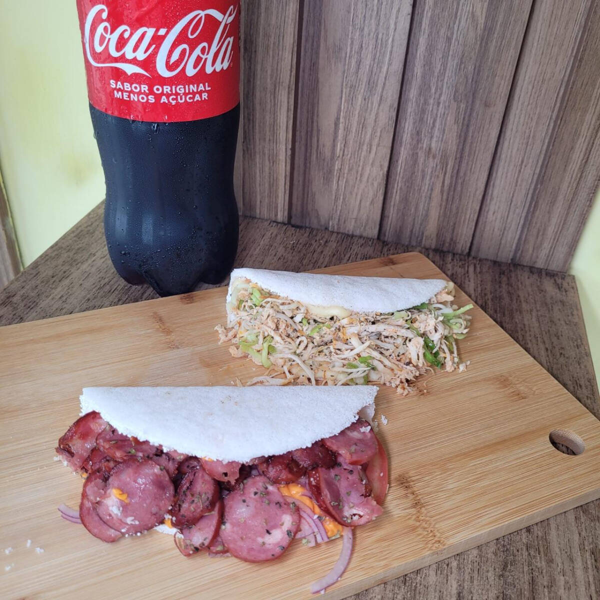 Goma de tapioca artesanal, recheada com frango desfiado ,queijo minas fresco, tomate rodelas e milho verde doce e suave.