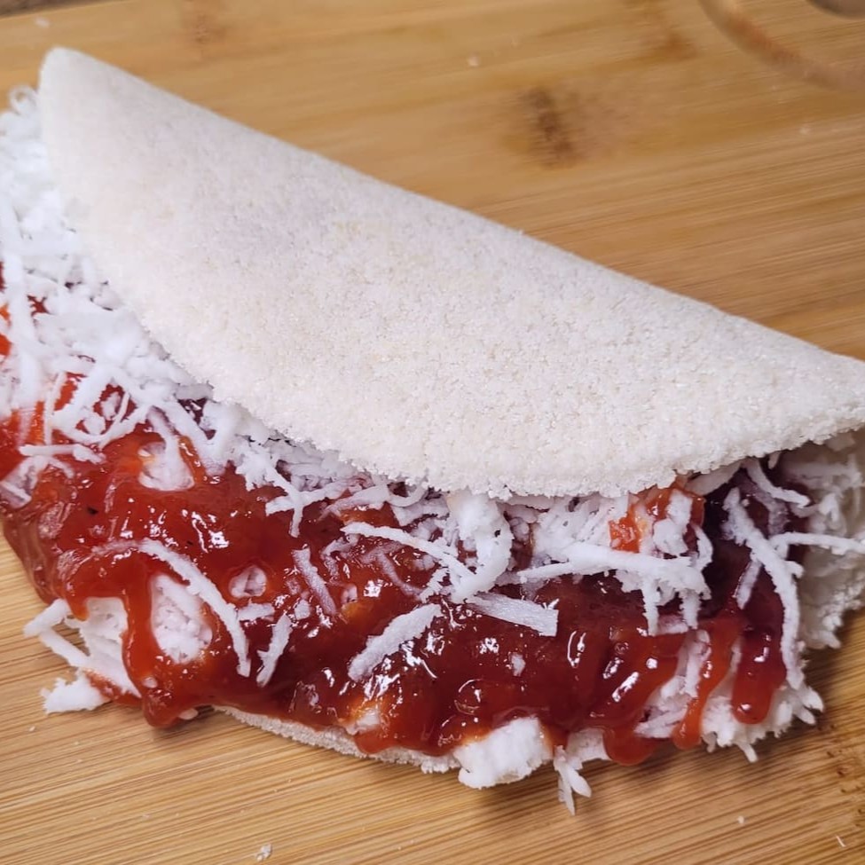 Goma de tapioca artesanal, calabresa fatiada, rodelas de tomate frescas, cebola roxa e azeitonas verdes, queijo derretido finalizada com um toque de orégano.