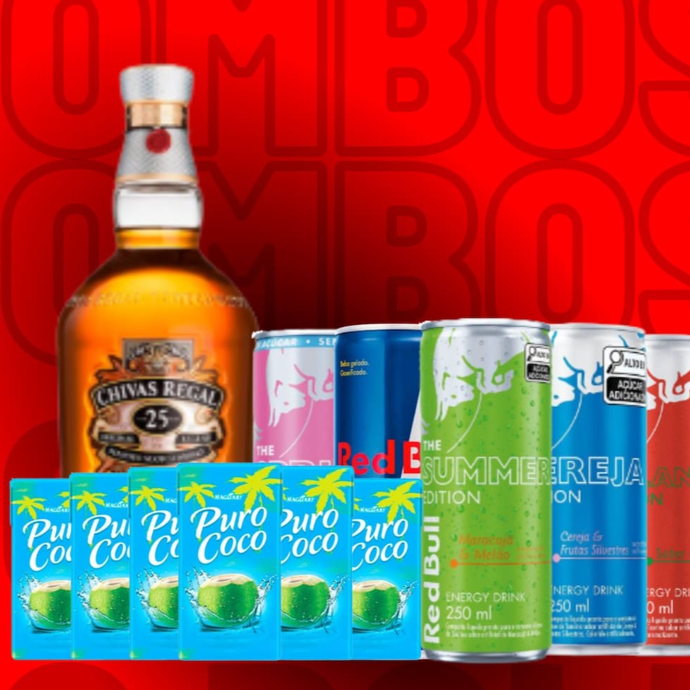 Promoção Especial! Leve Chivas 1l + 5 Red Bull + 6 Gelo de Coco e prepare-se para uma noite de diversão e energia! Entrega em até 30 minutos e bebidas geladas para curtir sem parar! Peça agora pelo e aproveite essa oferta imperdível! Chivas Redbull gelo kitfesta bebidaspremium promoção entregarápida bebidasgeladas energia festa