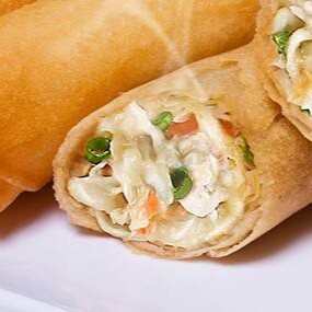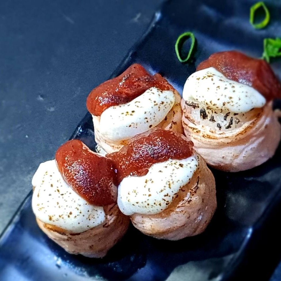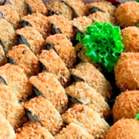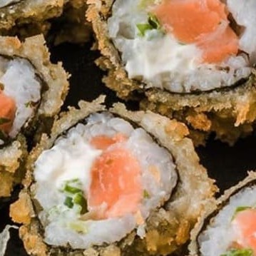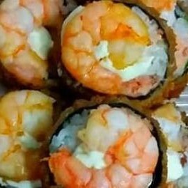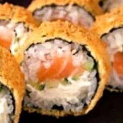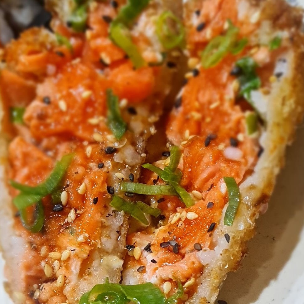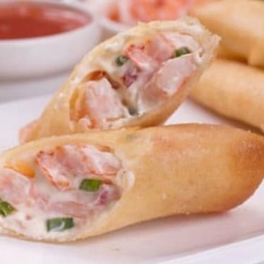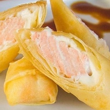 Recheio de salmão, cream cheese e cebolinha, frito com cobertura de camarão e cream cheese.