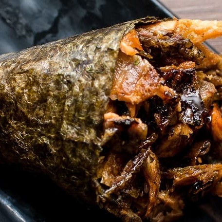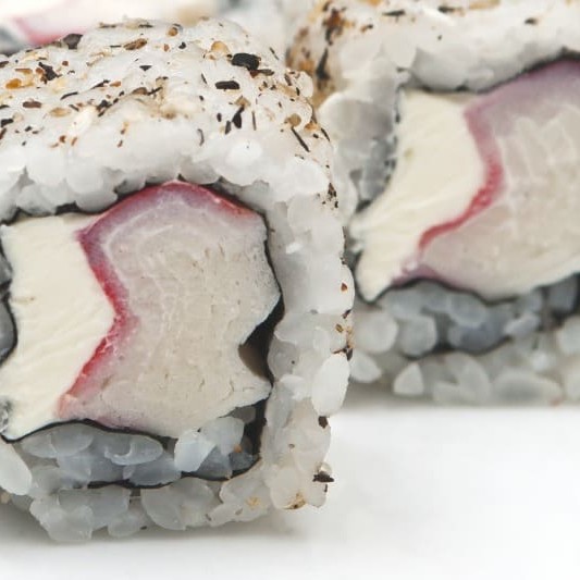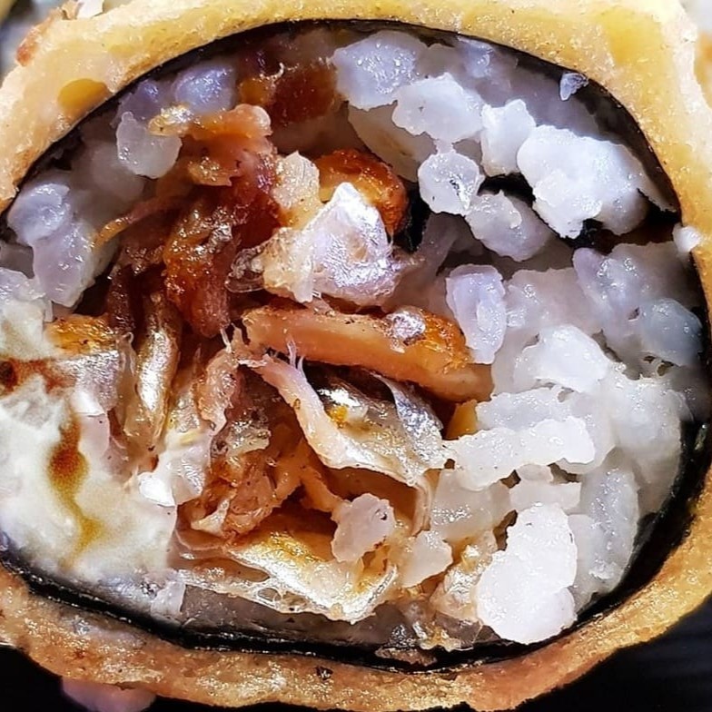 Recheio de pele de salmão, cream cheese e cebolinha.