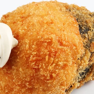 Recheio de pele de salmão, cream cheese e cebolinha, frito.
