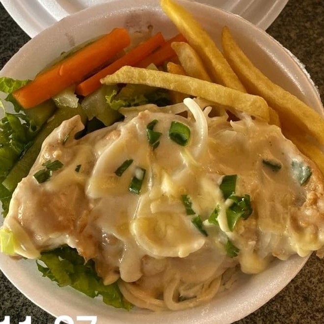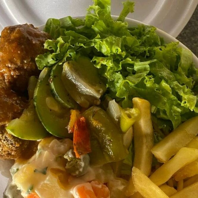 Acompanha: Arroz branco, feijao preto, farofa, macarrao, batata frita ou maionese e salada verde