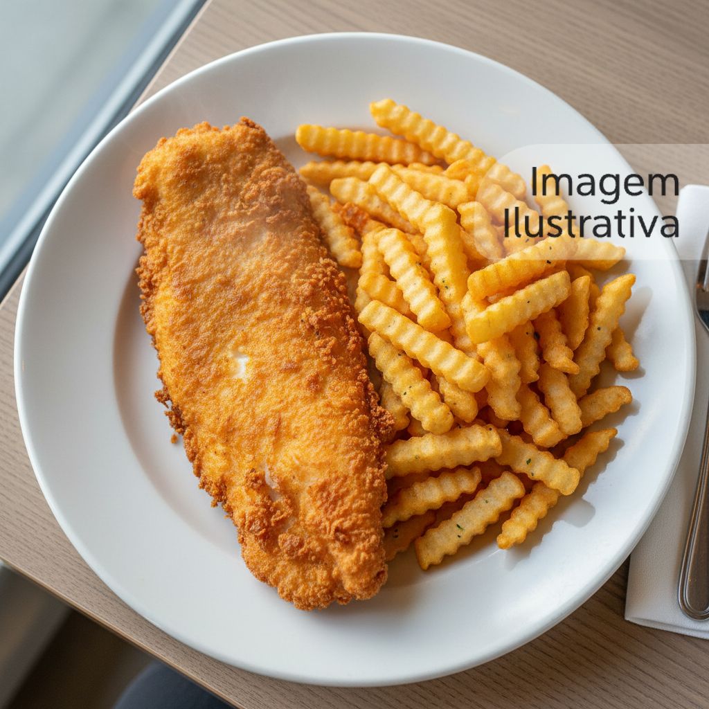 Delicioso filé de peixe frito acompanhado de crocantes batatas fritas.