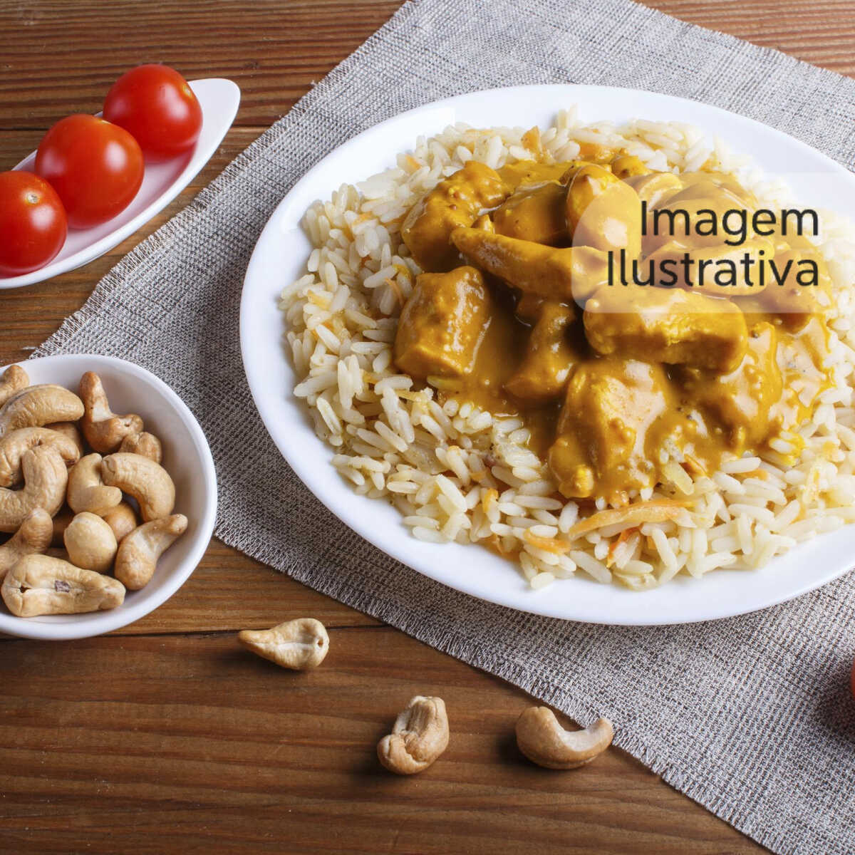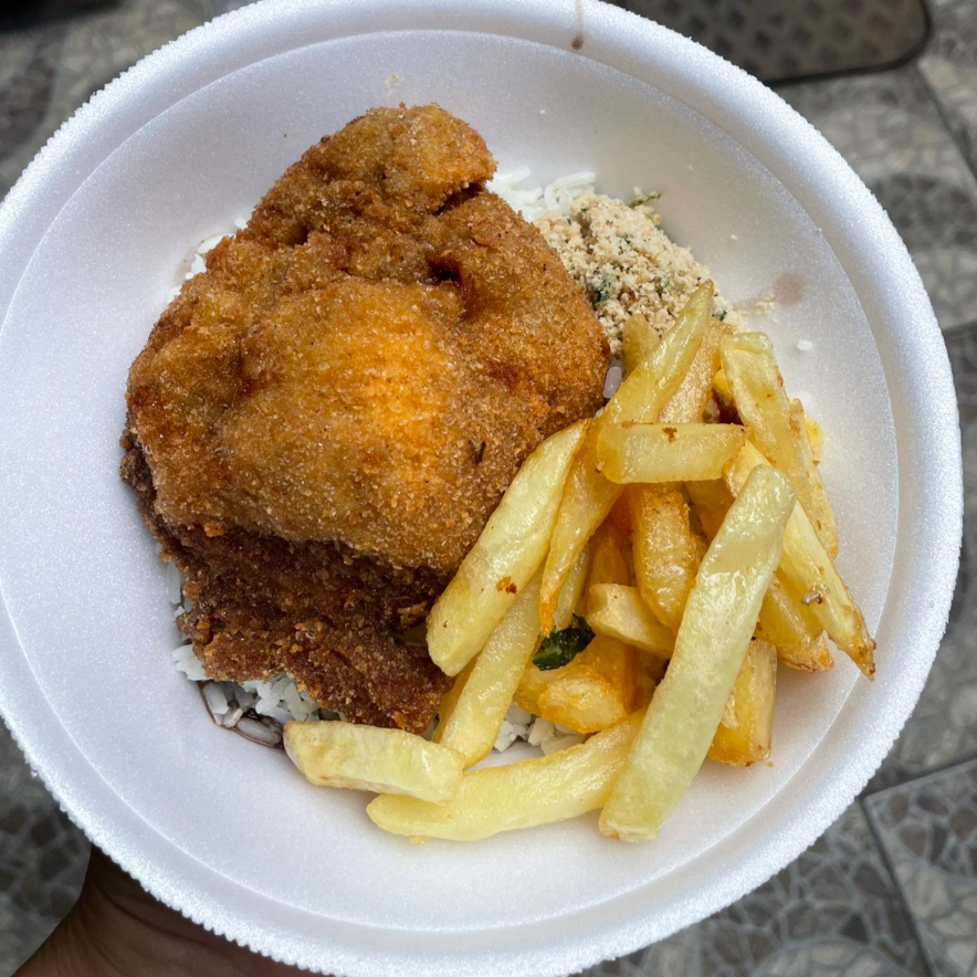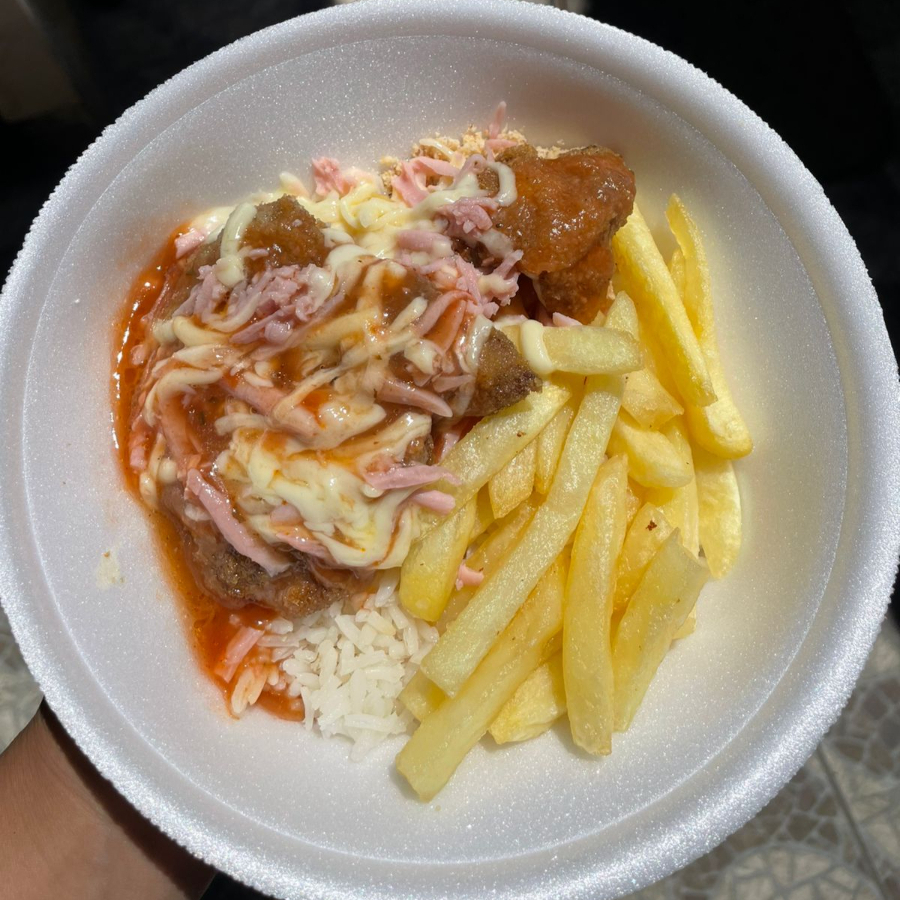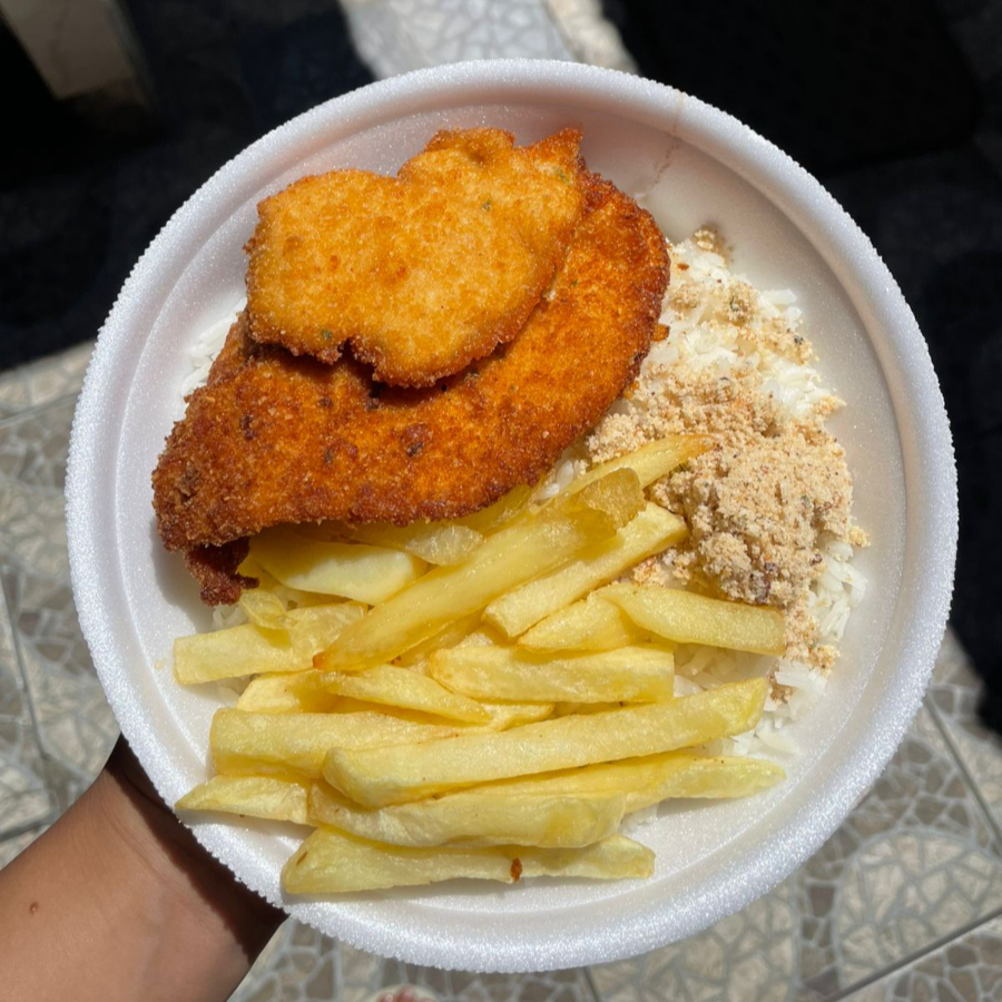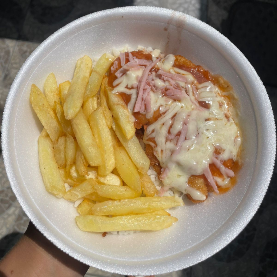 Arroz, feijão, farofa, peito de frango empanado, finalizado com molho de tomate, mussarela e presunto.