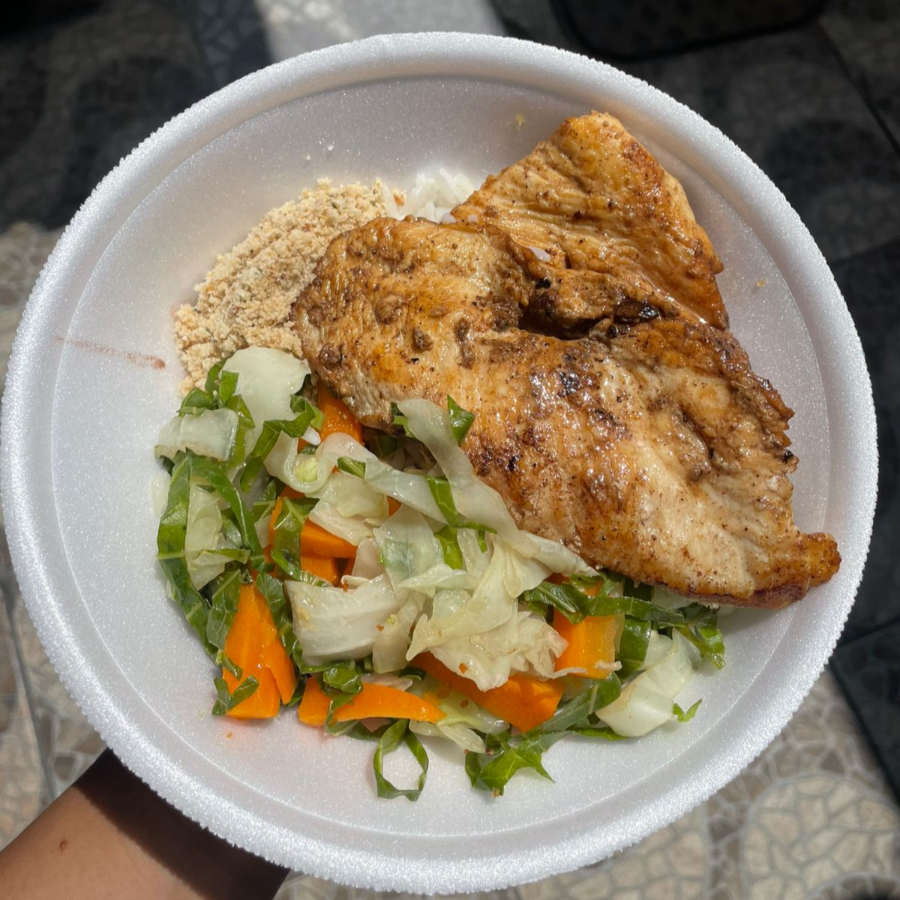 Arroz, feijão, farofa, peito de frango grelhado na chapa.