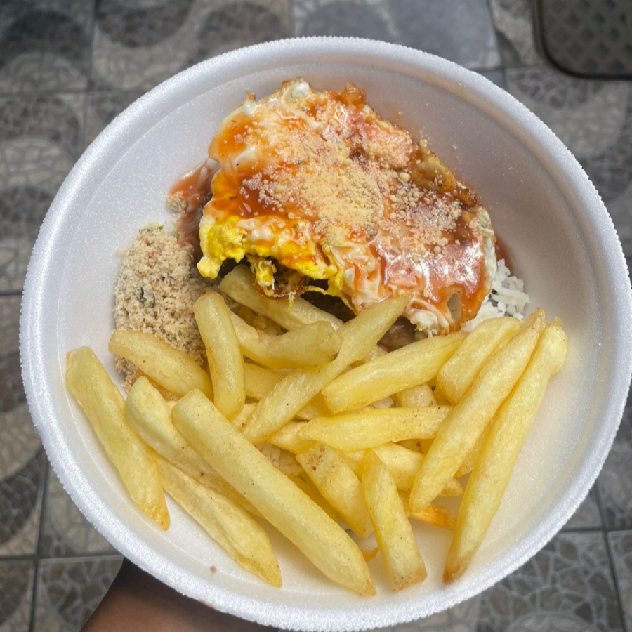 Arroz, feijão, farofa, contra filé com ovo, molho de tomate e queijo ralado.