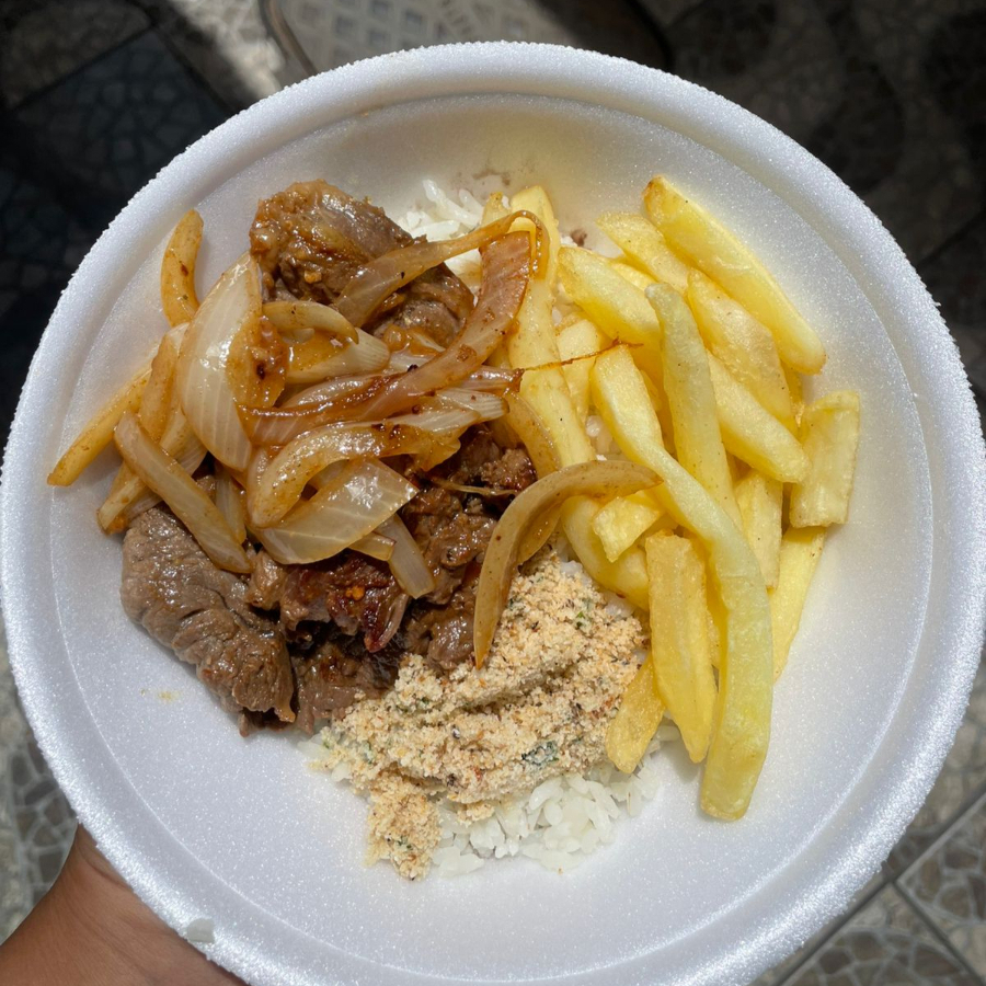 Arroz, feijão, farofa, contra filé com fatias de cebola.