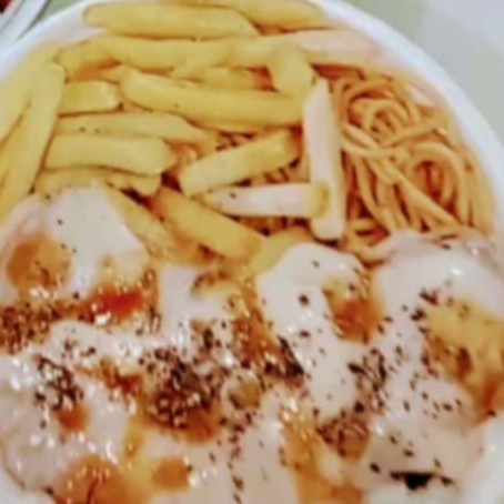 Arroz , feijão , Bife com molho especial, batata corada e espaguete.
