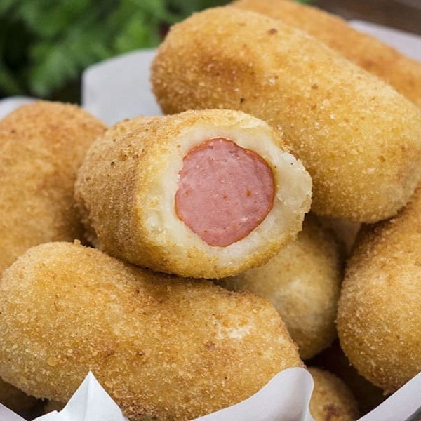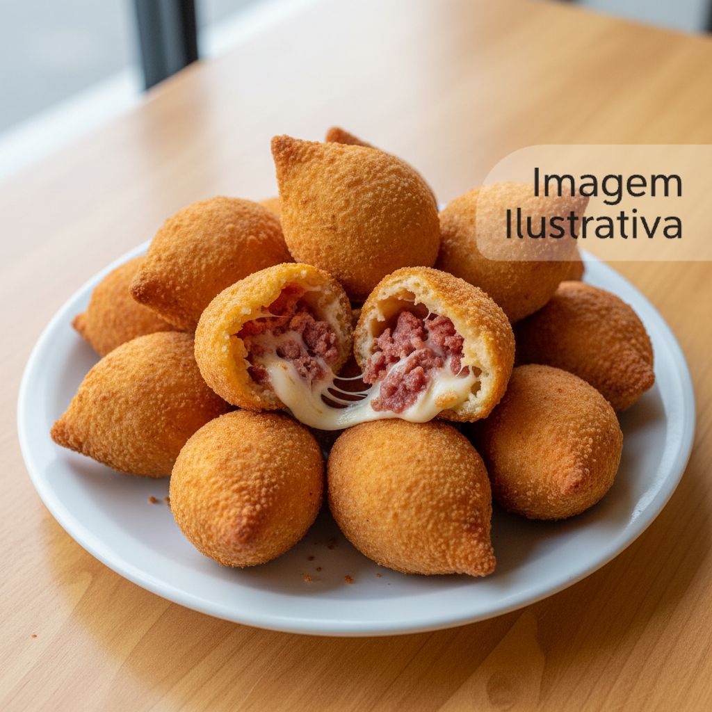Coxinhas pequenas e crocantes com recheio de calabresa picante e queijo.