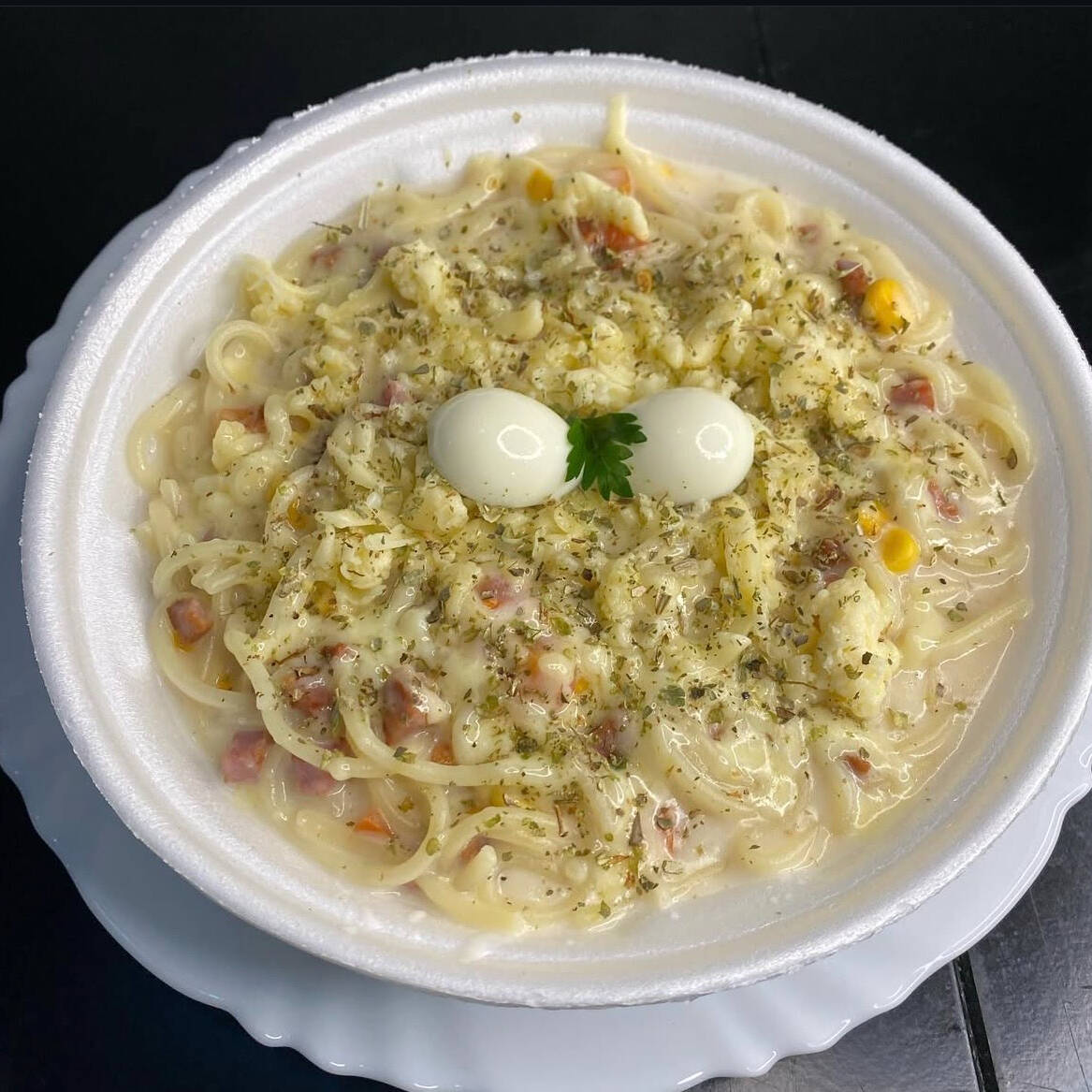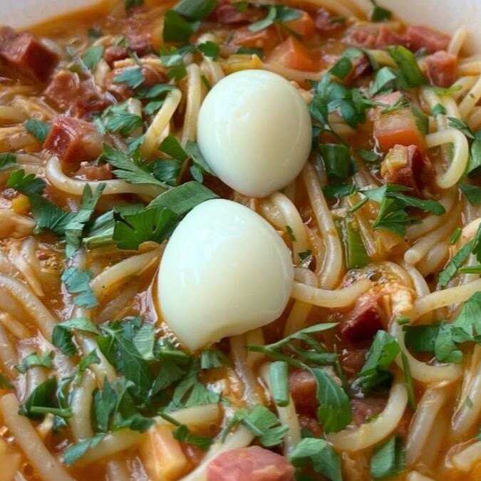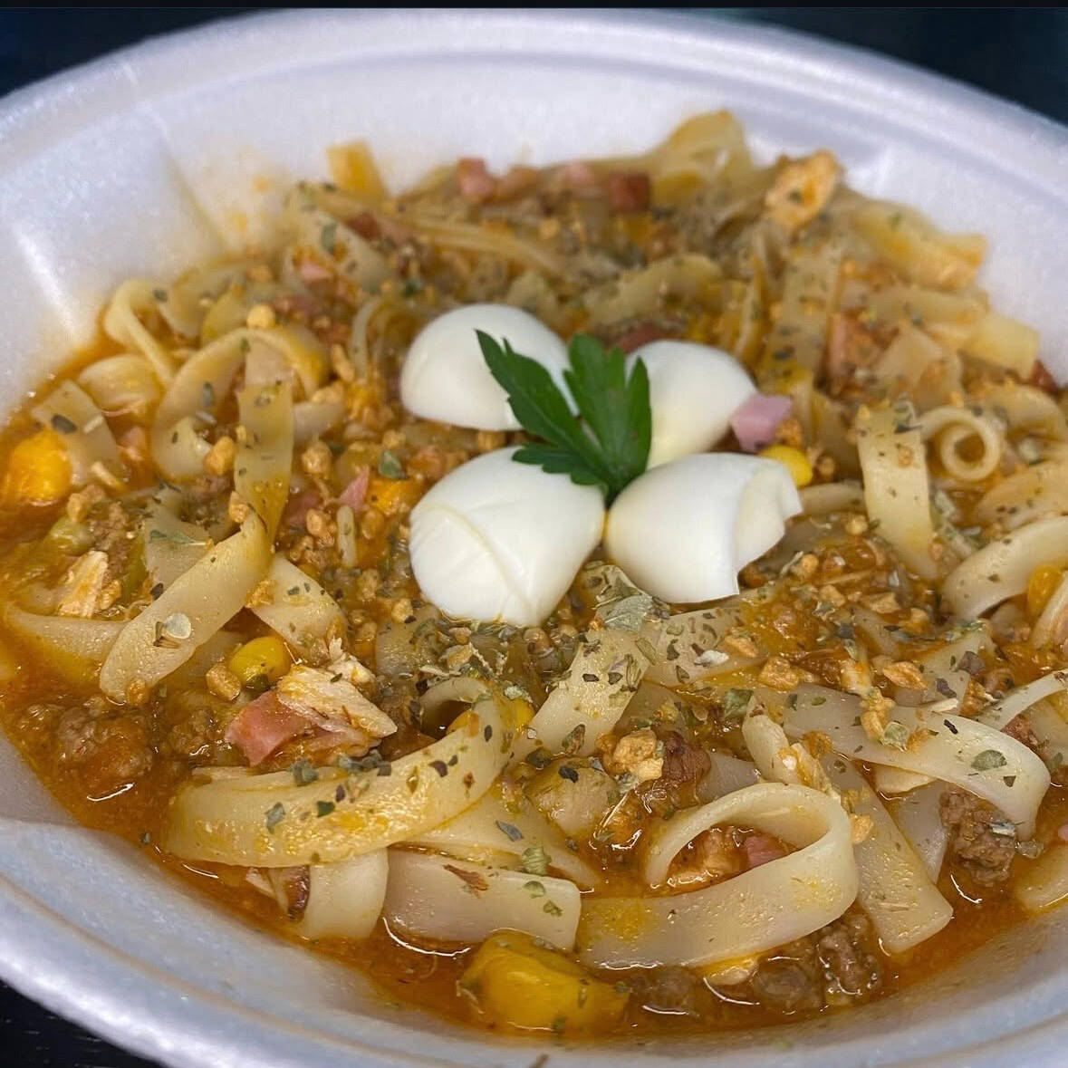 Massa talharim envolvida em um molho bolonhesa encorpado e cheio de sabor, com presunto salteados, milho e ovos de codorna, toque de alho, cebola e finalizado com alho torrado. Um prato irresistível.