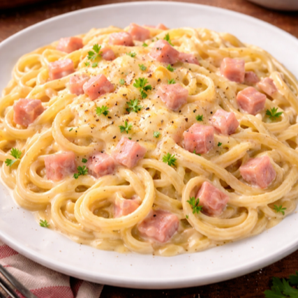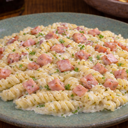 Delicioso talharim envolvido em um molho super cremoso de creme de leite, requeijão, queijo mussarela e presunto em cubos. (500g)