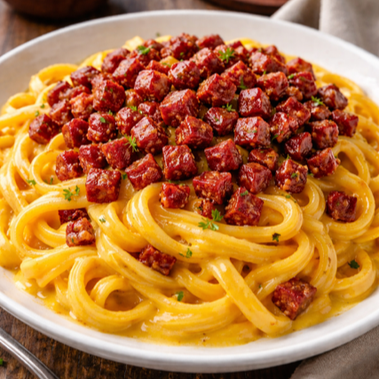 Talharim ao ponto ideal, envolvido em um molho cheddar cremoso, finalizado com uma generosa camada de calabresa em cubos pequenos, bem crocantes. Um prato intenso, saboroso, um prato delicioso. (500g)