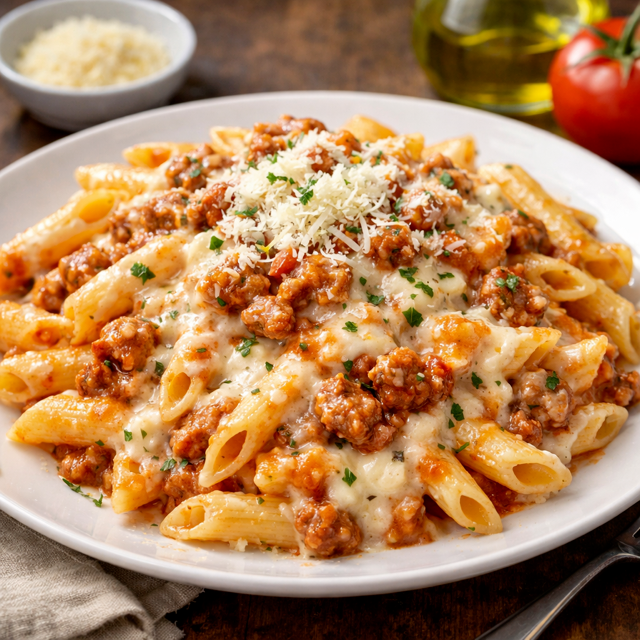 Massa penne cozida no ponto perfeito, combinada com o melhor dos dois mundos: molho bolonhesa artesanal caseiro, bem temperado e um molho branco irresistível. Finalizado com queijo parmesão, é um prato saboroso, ideal para quem ama cremosidade sem abrir mão do sabor marcante da carne. (500g)