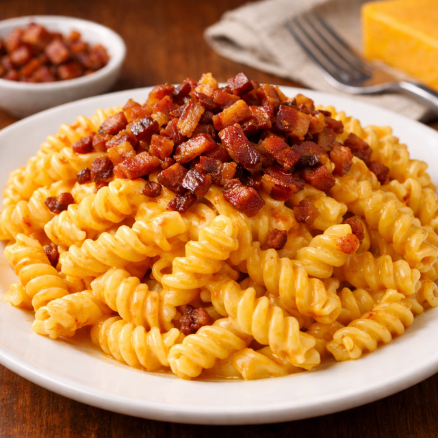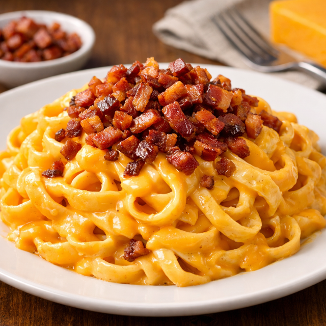 Delicioso macarrão ao Molho Cheddar com Bacon Crocante. Talharim envolvido em um cremoso e intenso molho de cheddar, com sabor marcante e finalizado com uma generosa camada de bacon frito crocante por cima. (500g)