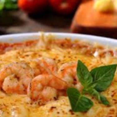 Espaguete de camarão com tempero da casa e bastante queijo gratinado ...
