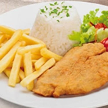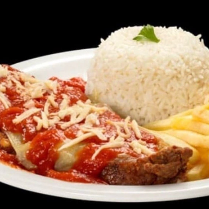Acompanha; arroz branco, feijão, farofa e fritas podendo trocar fritas por salada verde ou purê