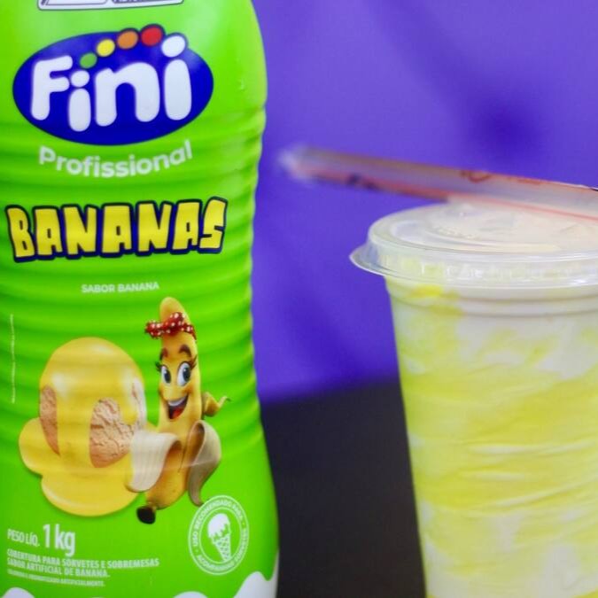 Copo Fini com creme sabor banana no fundo, mais creme no meio com até 3 complementos à sua escolha, e finalizado com mais creme Fini de banana no topo e balinhas Fini de banana. Uma explosão de sabor divertida que a criançada ama!