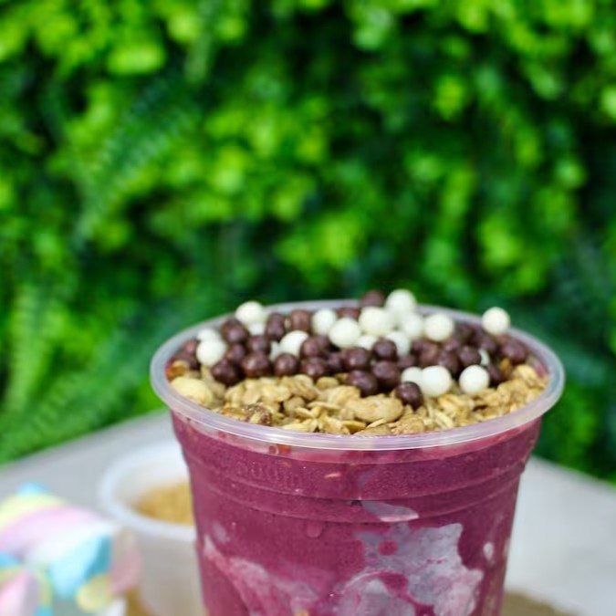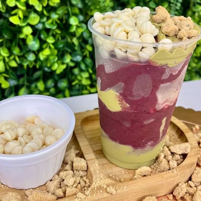 Açaí cremoso com creme de pistache, chocolate branco e farofinha crocante de cookies. Um combo diferente, marcante e cheio de estilo. Puro sabor em cada colherada!