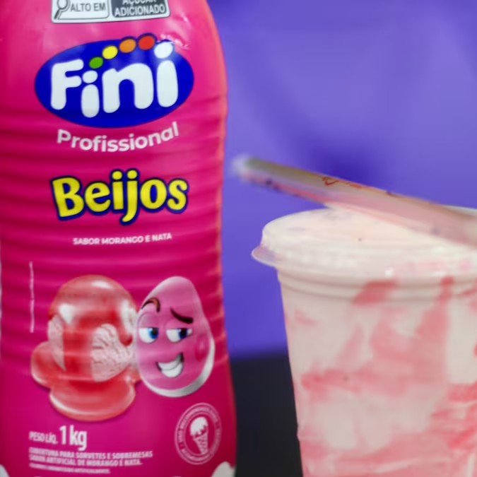 Copo Fini com creme sabor beijos no fundo, mais creme no meio com até 3 complementos à sua escolha, e finalizado com mais creme Fini de beijos no topo e balinhas Fini de beijo. Uma explosão de sabor divertida que a criançada ama!
