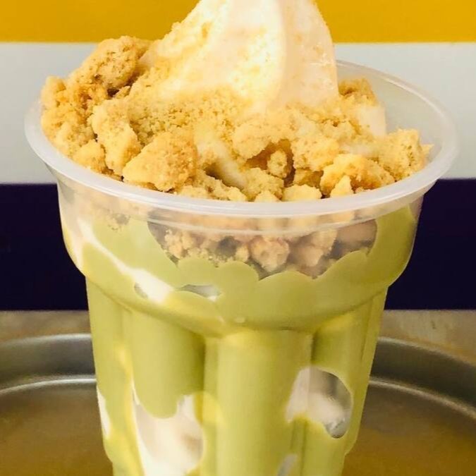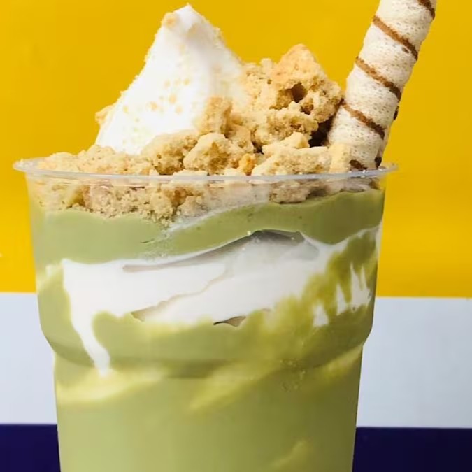 Sorvete batido com calda de pistache, cremoso e muito top saboroso.