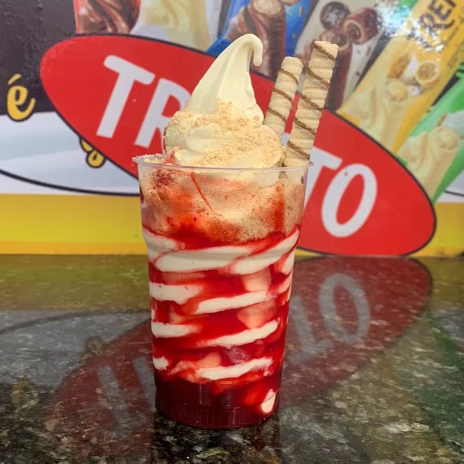 Escolha o sabor do sorvete e cubra com uma deliciosa calda de morango. Complete com amendoim crocante ou paçoca, conforme sua preferência. Uma sobremesa personalizada que combina o melhor do sorvete com um toque especial!