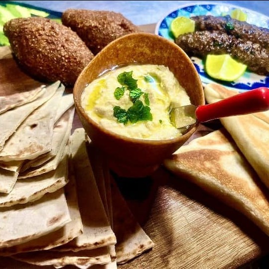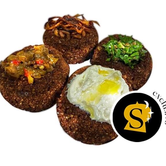 Está escrito, Maktub. Este combo é para você. Vem com kibe cru, tabule, 4 mini kibes, homus, coalhada seca e 3 pães.
