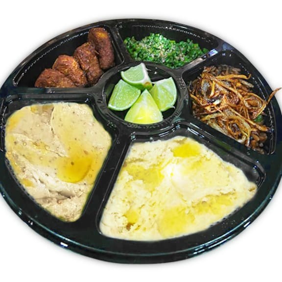Para você ter o prazer vegano na ponta da língua. Composto de mjadra, tabule, 4 falafel, homus, babaganoush e 3 pães.