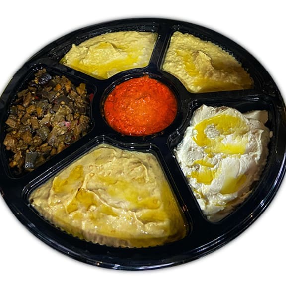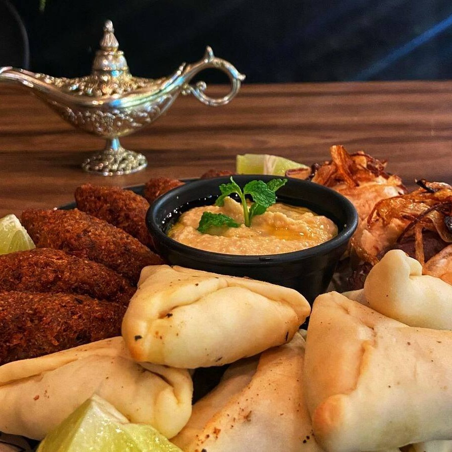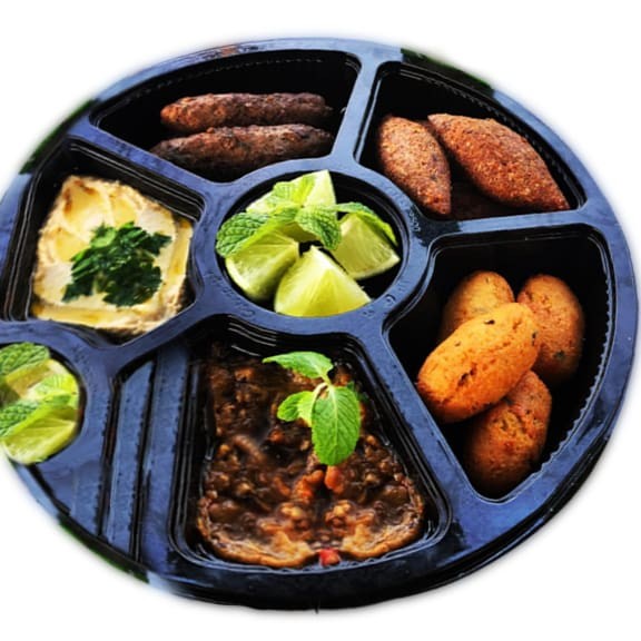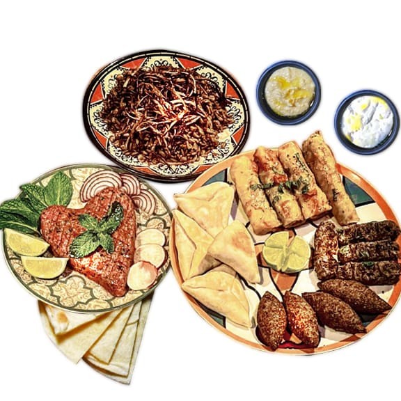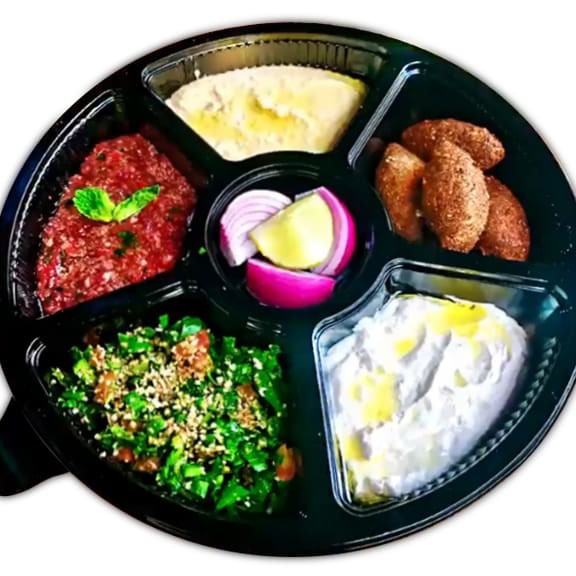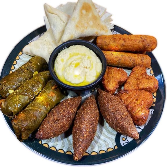 Esse leva sua mente ao paraíso do paladar, nós prometemos. Composto por 4 mini esfihas, 4 mini kibes, 4 mini kaftas, 4 charutos de repolho, mjadra, meio kibe cru, 60g de homus, 60g de coalhada seca e 3 pães.