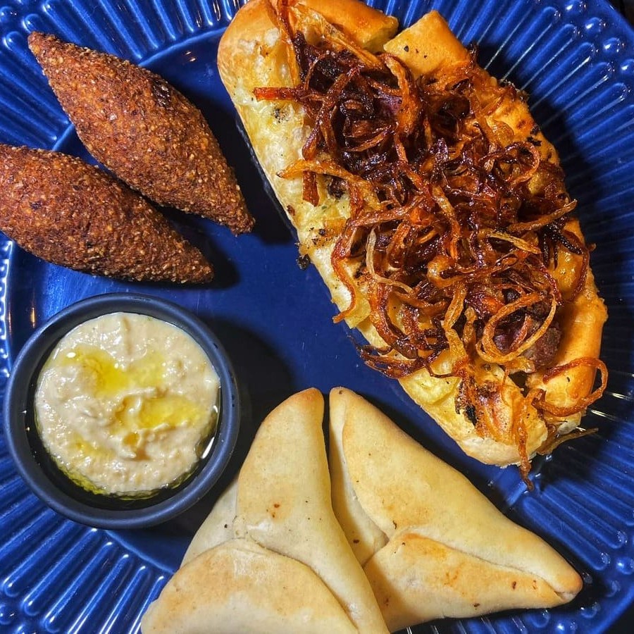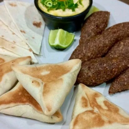 Direto de Beirute para você degustar. 2 kibes, 2 esfihas, 2 kaftas, 250g de homus e 3 pães
