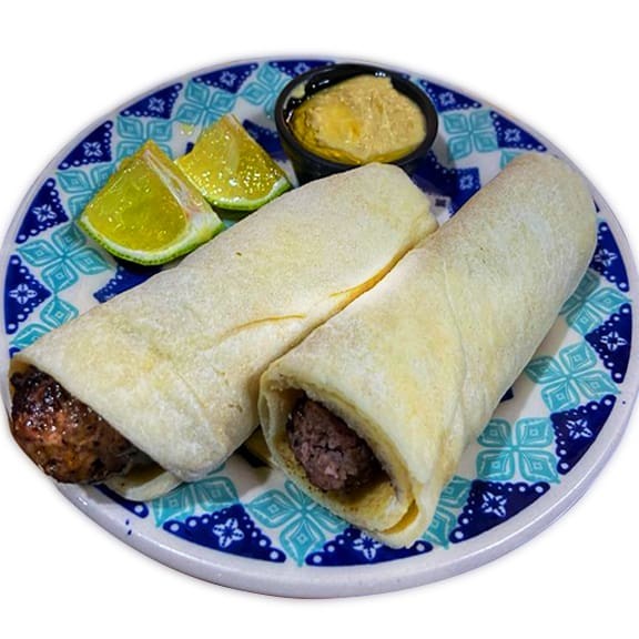 Um espetáculo de sanduíche. Feito com pão árabe e duas kaftas, acompanha 60g de homus. Experimente.