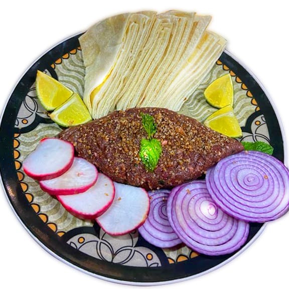O nosso kibe cru bem temperado em uma versão completa para você(s). Kibe cru acompanhado de cebola roxa, rabanete, hortelã e limão. Acompanha 6 pães árabes.