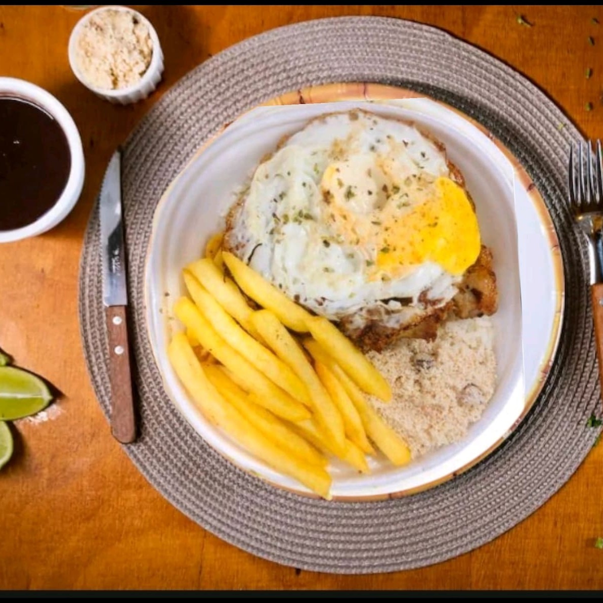 Frango à Milanesa: Deliciosos pedaços de frango empanados com uma crosta crocante e dourada, feitos com uma combinação especial de pão ralado e temperos. Um clássico da culinária italiana que conquista paladares com sua textura irresistível. Acompanhando arroz feijão macarrão farofa.