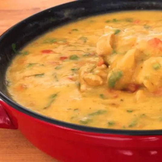 O Bobó de Frango com Azeite de Dendê é um prato feito com pedaços de frango cozidos em um molho cremoso à base de mandioca (ou aipim) e leite de coco, que traz uma textura aveludada. O azeite de dendê adiciona um sabor característico e um toque especial ao prato.