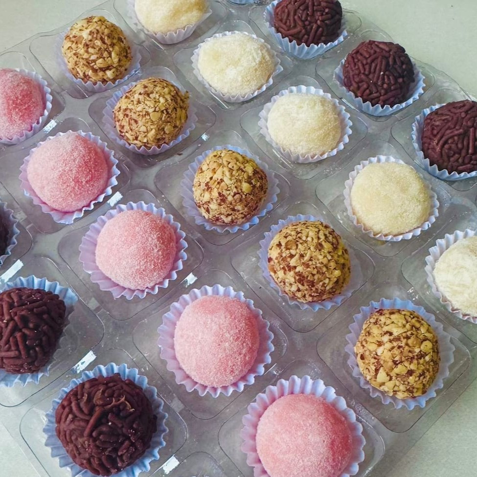 25 Docinhos de festa mistos. É composto por 4 sabores de docinhos. (Brigadeiro, Ninho, Moranguinho e Amendoim) Forminha n6 (10g)
