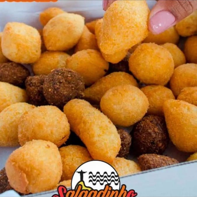 100 salgadinhos misto frito no óleo de algodão que garante um salgadinho crocante e sequinho.