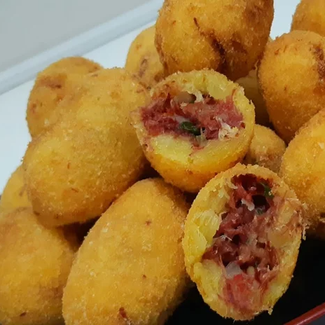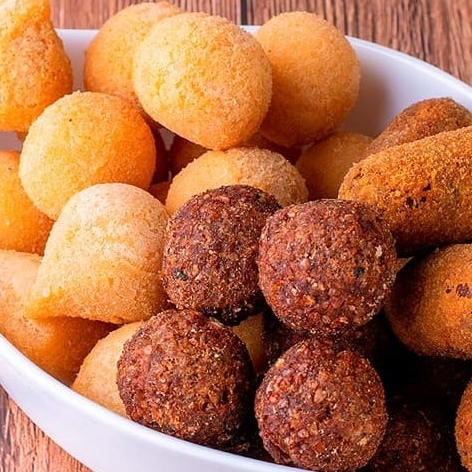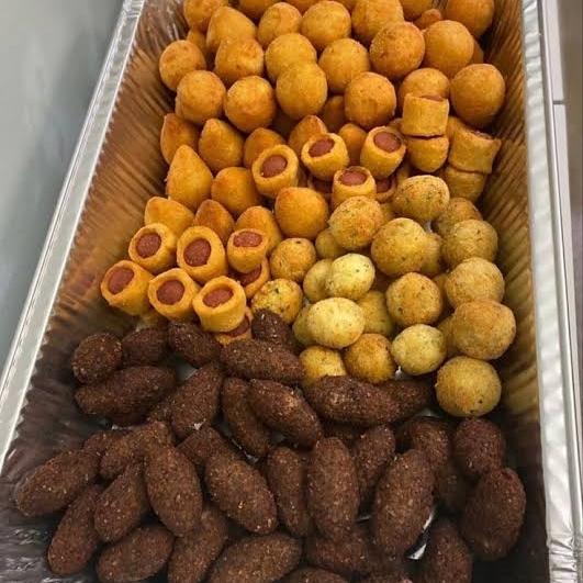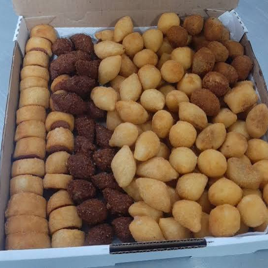 são sortidos nos sortidos vai coxinha, bolinha de queijo, presunto, pizza, carne seca e entre outros.