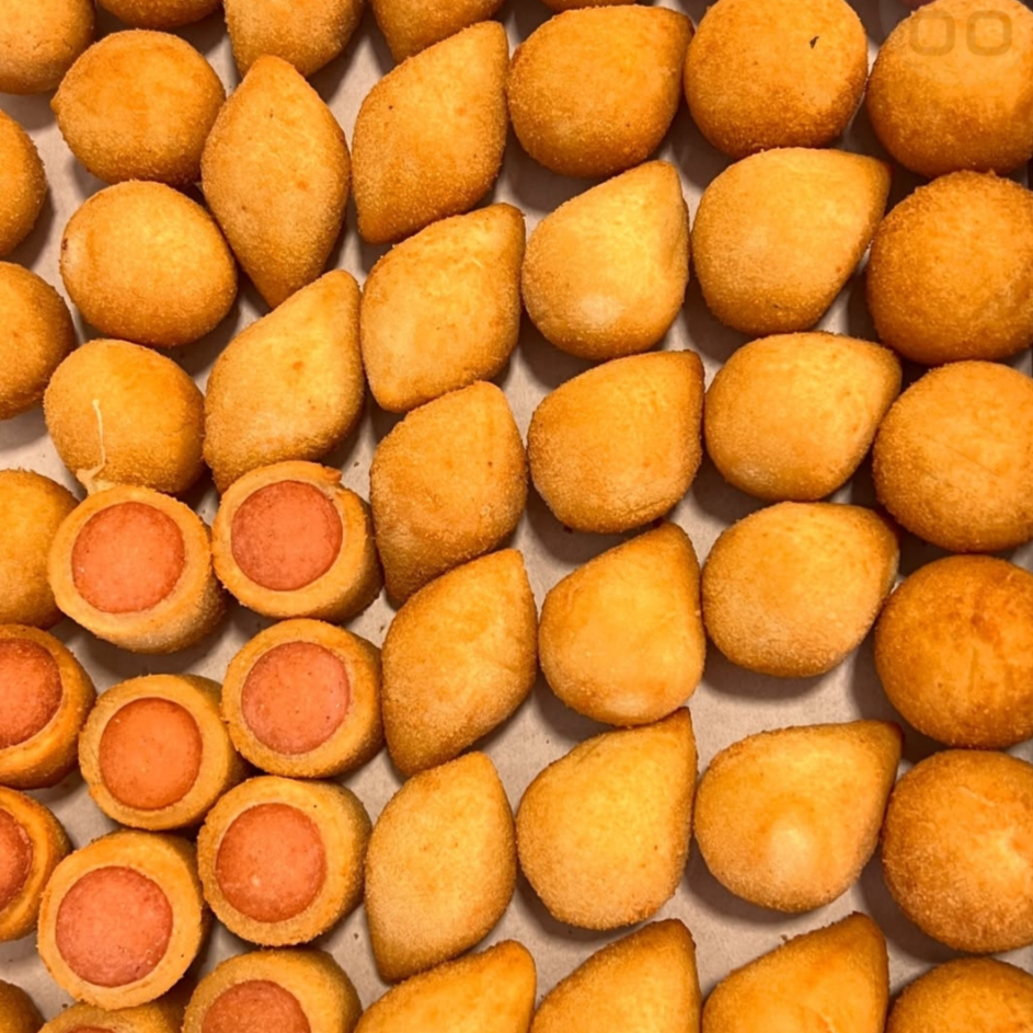 40 salgadinhos fritos na hora. Escolha ate 4 opções de salgadinhos. Salgadinhos tamanho festa.